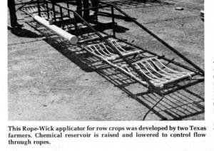Rope wick applicator for weed control. The vogels wick weeder is a rope wick applicator that efficiently places herbicide on the weed surface giving good control options over a broad range of weeds and vegetation conditions. We saw different types of rope wicks sponge wipers and several types of carpet wipers and rollers. Rope a dope tm gravity flow applicator gravity flow principle pour chemical into pipe tilt ropes to desired angle 45 degrees downward recommended and wipe wet ropes across weeds. An herbicide wick allows herbicide to be brushed onto weeds without getting any on crops or plants.